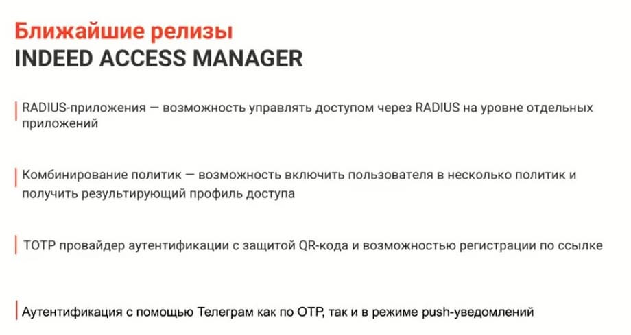 The slide shows the upcoming releases. These releases are planned for approximately the end of the summer. I will add that we have already added the ability to authenticate using Telegram from the upcoming releases. UTP- and push notifications can come there. For example, you can make it so that an employee receives a push notification and they only need to press the confirmation or rejection button when they try to authenticate.