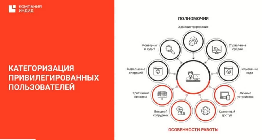 I will move on to the next product - Indeed Privileged Access Manager. Management and protection of privileged access by privileged users. The question arises, who are privileged users? There is a very informative slide «Categories of Privileged Users».