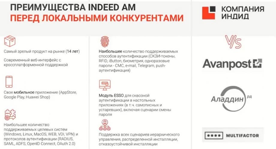 Our domestic competitors: Мультифактор, Аладдин, Аванпост. Мультифактор is a cloud solution. Аладдин and Аванпост, like us, are on-premise. What are our advantages? We have the most mature product on the market. Our product, like the entire company, is turning 15 years old. We have the largest number of supported authentication methods, our own mobile application.