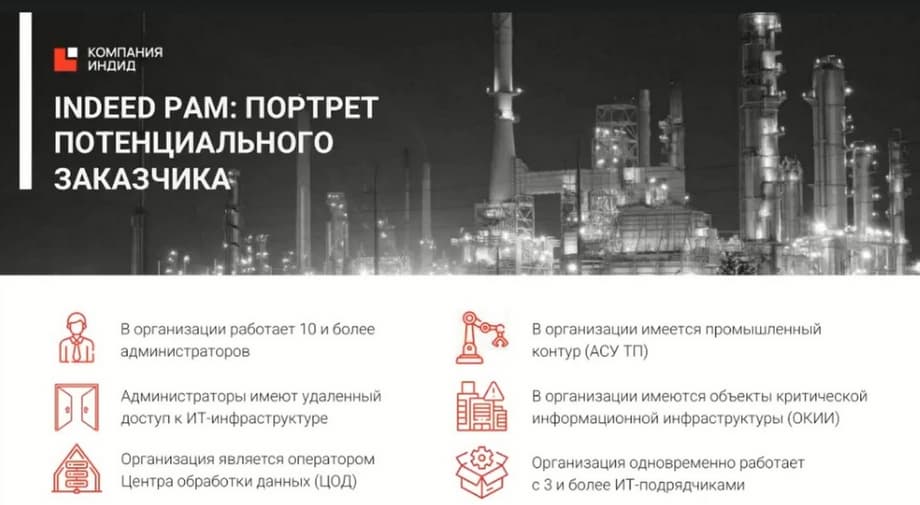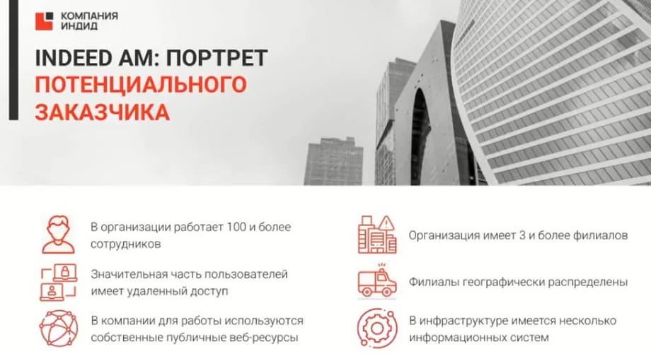 So, the question arises of who needs our product. We have 6 points on the slide. If at least 2 of them are suitable, you can safely go to the customer. For example, if an organization employs 100 or more employees, or a significant part of the employees are working remotely, or the branches are geographically distributed. We know such - we boldly go and offer our IАМ.