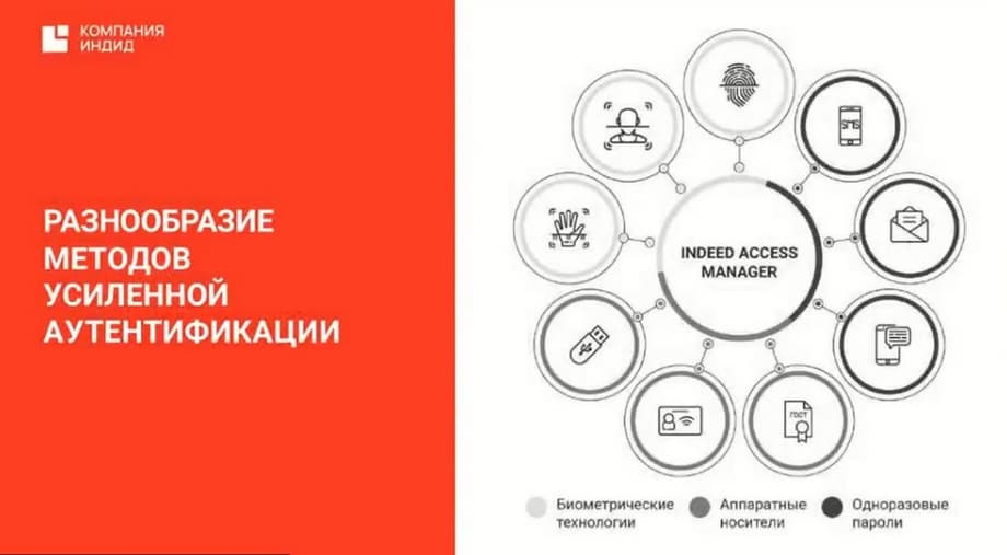 What are these enhanced authentication methods that I mentioned? These are biometric technologies: fingerprint, palm vein scan, 2D-3D face contour, these are hardware tokens. Let me clarify right away. We are software vendors. We do not have our own physical tokens, we do not develop hardware platforms and other physical tokens. We can load our software onto a friendly hardware token developer. These are cards or scans for the hand or finger. Also this is the generation of one-time passwords and push notifications.