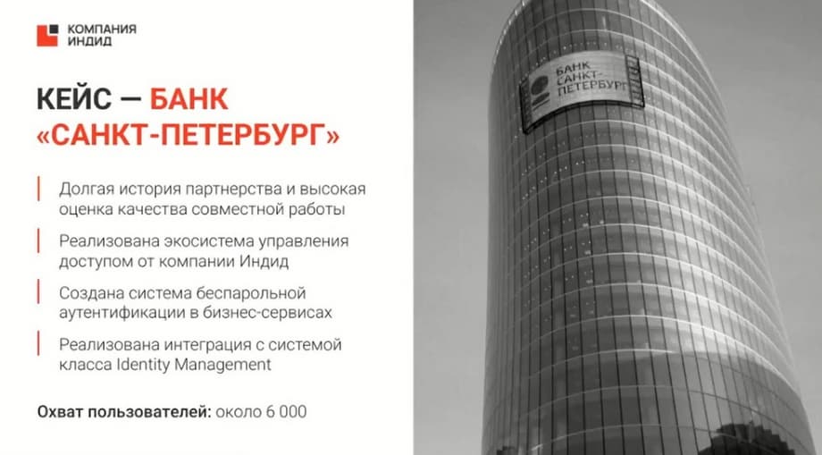 The second case is interesting because the customer, Bank St. Petersburg, has all 3 of our products. Initially, the customer bought our IАМ for employees who travel to customers with their laptops and tablets. What can happen if an attacker gets such a tablet or laptop? Of course, they will be able to gain access to all information about the employee, about the company, and, even worse, about the customers of this bank. Of course, this is completely unacceptable. Here, the customer uses sms messages as a second factor, which come to the employee's mobile phone. If an employee has lost their laptop or tablet, they can always quickly contact their admin, explain the situation to them, and they will simply block all access for them.
