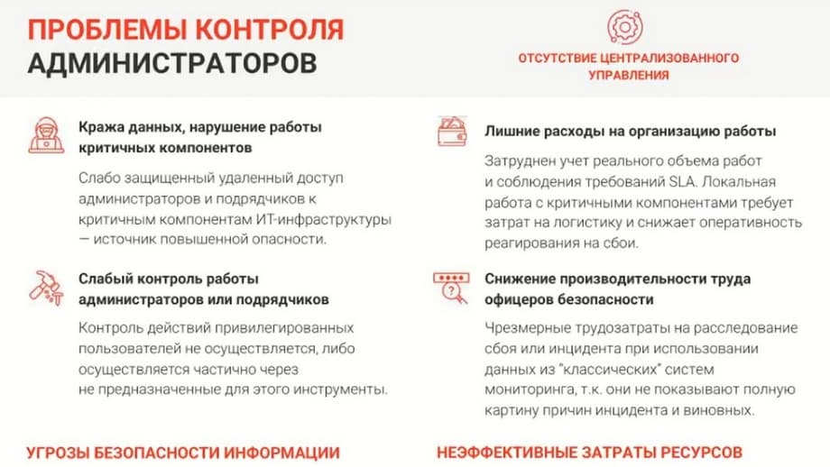 We have distributed privileged users by authority and by the peculiarities of work. This may be an external employee who, for example, has access to the customer's infrastructure, or it may be an authorized auditor who cannot make any changes to the customer's infrastructure, but can see confidential information and use it. For some customers, the financial director or accountant is considered a privileged user. But we are considering here administrators and contractors.