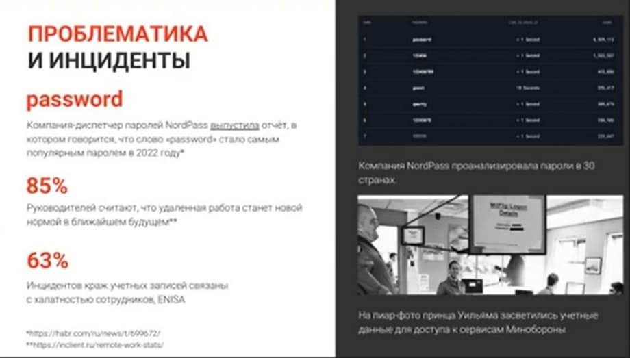 I'll tell an interesting story. Once Prince William came to the Ministry of Defense for an inspection. On such an occasion, it was necessary to gather the press service in order to take photographs. The photographs were taken. And in one of them, a piece of paper with the login and password of a Ministry of Defense employee accidentally ended up in the frame, which he had hung on the table higher so that everyone could see it, so that he himself could see it. The distribution of this photograph could not be prevented. It ended up on the Internet, but the Ministry of Defense managed to change access for all its employees in the shortest possible time. Attackers did not manage to carry out any malicious actions in the infrastructure of the ministry.