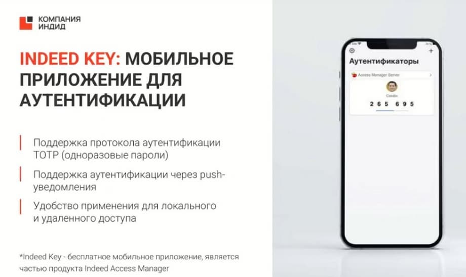 Also to enhanced authentication belongs our mobile application Indeed Key. It works in two modes. The first mode is the generation of one-time passwords. In this case, a network connection is not required. The second way is the generation of push notifications. Here, a network connection is already required. The mobile application is free. It can be downloaded. And it works in two languages: Russian and English.