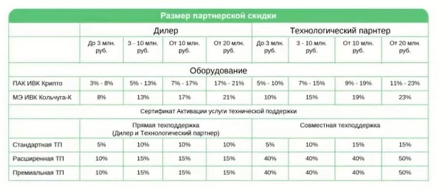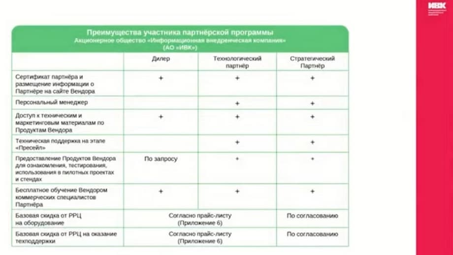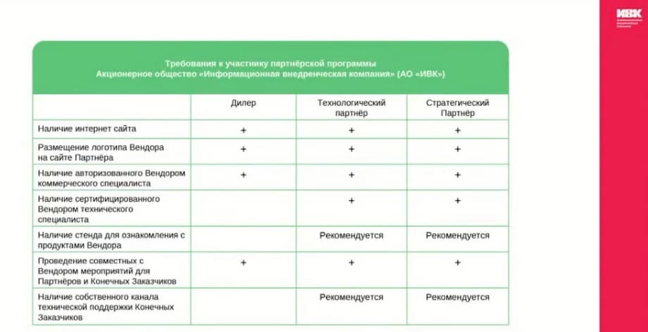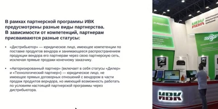 Within the framework of the IVK partnership program, different types of partnership are provided depending on the competencies. Partners are assigned different statuses: distributor – a legal entity that has the competencies to supply the vendor's products and distributes its products through its partner network; authorized partner – a legal entity that does not have direct contracts with the vendor, but has the opportunity to work with the vendor through the distributor under the terms of this partnership program. Authorized partners include the statuses of dealer and technology partner. There is also another status, which is a strategic partner. These are legal entities whose turnover with IVK exceeds 50 million rubles and who have experience in integrating into the end customer's infrastructure, including in complex solutions, and providing technical support services.
