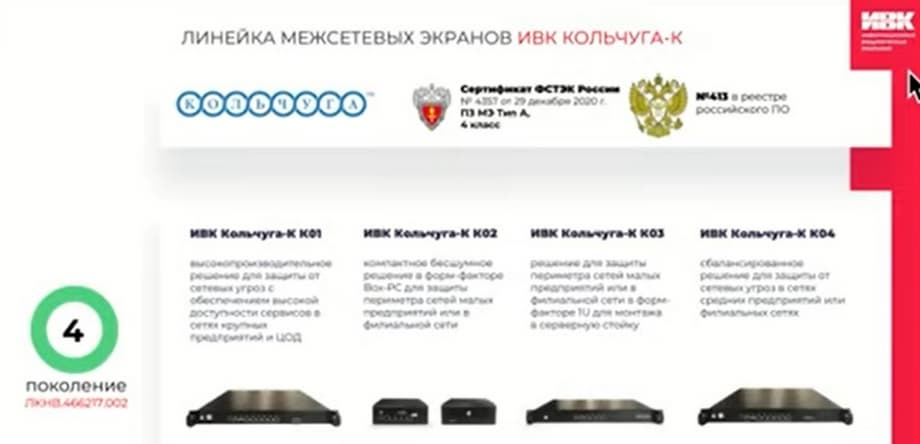 "IVK Kolchuga-K" is a firewall and communication center for perimeter protection. The first firewall was produced by IVK in 2005. Currently, the fourth generation of firewalls is being produced. It has a certificate from the FSTEC of Russia. The software of the IVK Kolchuga-K firewall is developed on the basis of the domestic Sisyphus repository and is included in the Unified Register of Russian Programs under number 413. IVK firewalls are supplied in the form of software and hardware complexes. The line of firewalls consists of four devices: Kolchuga-K-01, -02, -03 and -04. Three of these devices are produced in the form of single-unit devices for placement in a server rack, Kolchuga K-02 is produced in the Box-PC format. The assembly of the Kolchuga-K software and hardware complex is carried out at the production site of JSC IVK in Elektrostal.