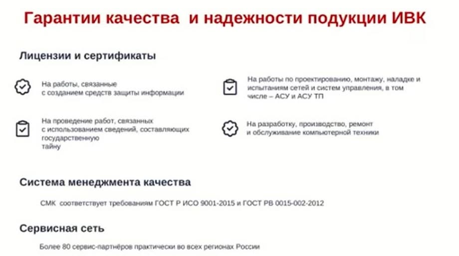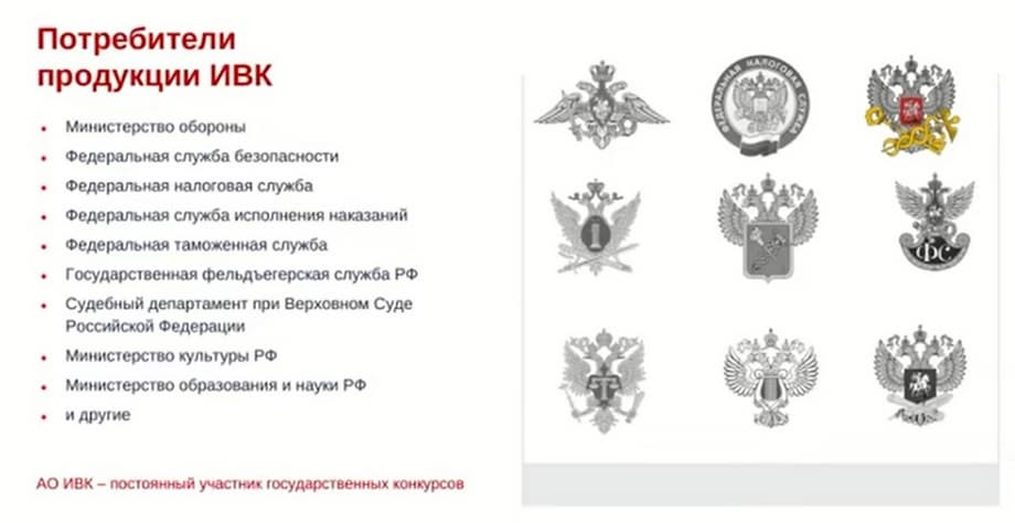 The end customers are government agencies, commercial organizations, the armed forces of the Russian Federation, and subjects of critical information infrastructure. JSC IVK is included in the consolidated register of organizations of the military-industrial complex of the Russian Federation.