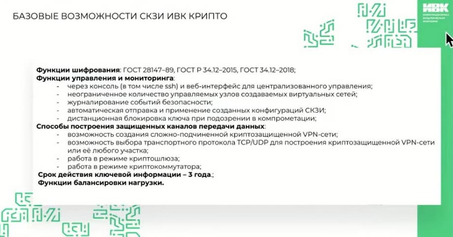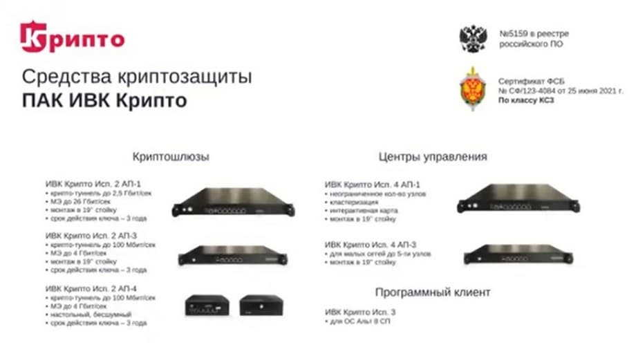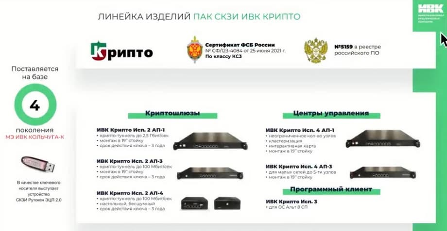 A few words about the line of products of the IVK Crypto encryption tool. This product is built on the basis of the fourth generation of the IVK Kolchuga firewall. The IVK Crypto encryption tool is a composite product, at the heart of which you get the Kolchuga firewall itself, as well as additional functionality in the form of cryptographic protection functions. This software and hardware complex is called IVK Crypto, it also has an FSB certificate, and is included in the Register of domestic software. It is produced in several versions. Here are presented crypto gateways in various hardware platforms, control centers and software clients.