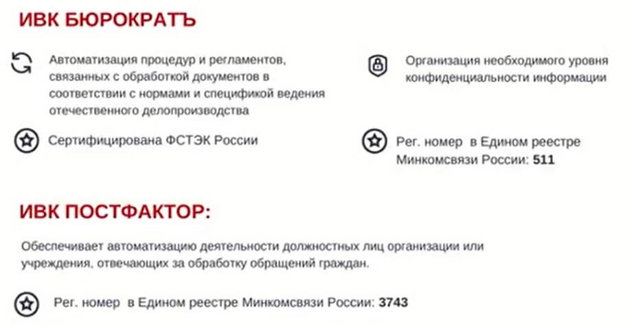 In addition to the "Alt" OS, the company has developed other software products. IVK solutions are used as the basis for building a system of confidential electronic document management in the structures of the Ministry of Defense of Russia and also for the system of automatic processing of citizens' appeals. For these purposes, the software products IVK BUREAUCRAT and IVK POSTFACTOR have been developed. All software products developed by IVK are included in the unified register of the Ministry of Communications of Russia.