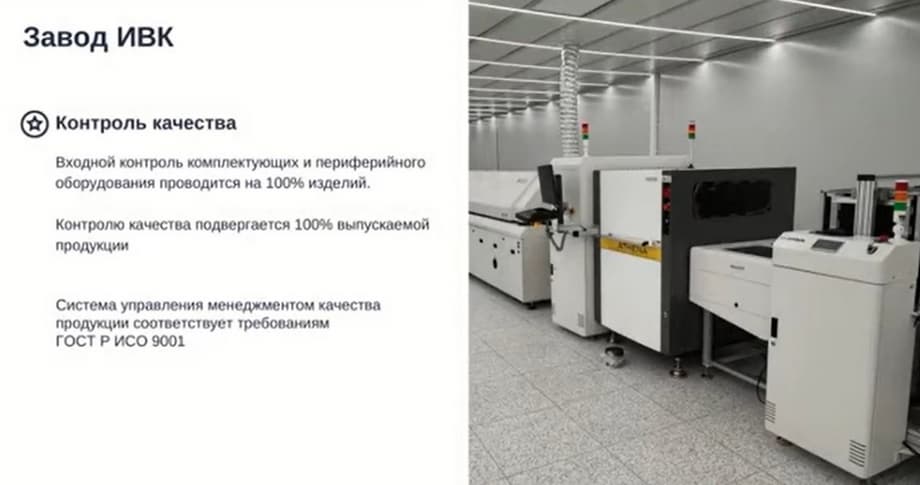 The company's production facilities are certified according to GOST 1090-1 and allow the production of up to 300,000 units of computing equipment per year. To achieve a high level of reliability, 100% of the products are subject to quality control.
