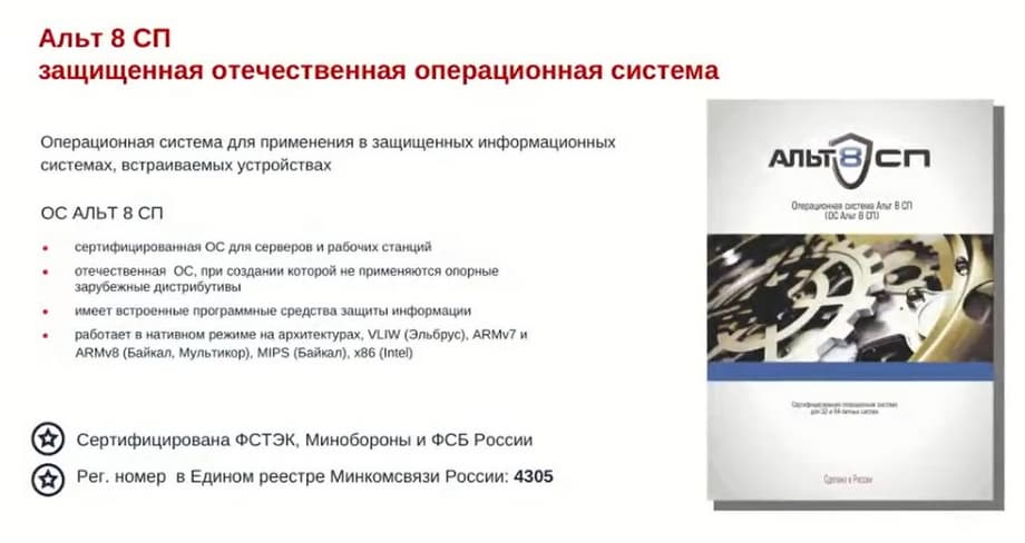 In the field of software development, the flagship product is the "Alt" family of operating systems. "Alt" OS for servers and workstations, including the secure "Alt 8 SP" OS, which has certificates from the FSTEC of Russia, the FSB of Russia, and the Ministry of Defense. The development was based on the principle of ensuring independence from foreign repositories, OS developers based on the Linux kernel. The "Sisyphus" repository is not a derivative of repositories such as Debian, Red Hat, Suse, etc. This ensures independence from the development vectors of foreign repositories and active support at the repository level for processors of Russian architectures, as well as the possibility of developing and producing a domestic OS in conditions of the risk of sanctions pressure.