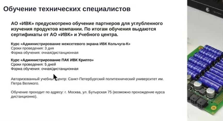 IVK has developed and provides training for partners to deepen their knowledge of the company's products. Upon completion of the training, certificates are issued from the vendor and from the training center. Two courses have been developed: a course on administering the Kolchuga-K firewall, with a duration of 3 days, and a course on administering the IVK Crypto software and hardware complex, with a duration of 5 days. The authorized training center is St. Petersburg Polytechnic University named after Peter the Great. Training takes place in our office in the training class at the address: Moscow, Butyrskaya str., 75. It is possible to take the course both in person and remotely.