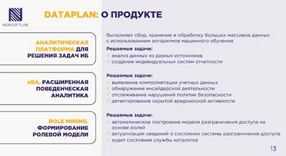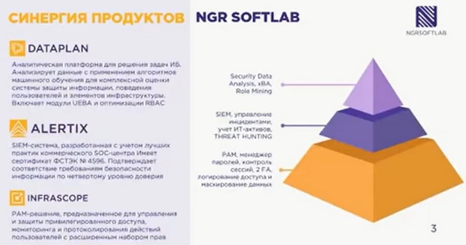 Currently, we have 3 classes of solutions in our portfolio. The first product is Dataplan. This is an analytical platform for solving information security tasks, and there are currently no analogues on the Russian market. Alertix is a SIEM system. It has an FSTEC certificate for the 4th level of trust. It is worth mentioning that one of the largest commercial SOCs in Russia is built on the basis of Alertix.