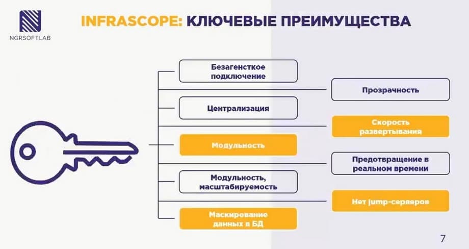 Our main advantages. The solution is agentless connection, i.e. there is no need to install an agent on the end hosts to which we connect, and also no agent is required on the administrator's machine in order to connect to the system. We have various modules, so we can deploy and purchase licenses only for the functionality that is really necessary for the customer to solve his current infrastructure task. Also, our solution is modular and at the same time it is easily scalable. We can choose such a unit as a server and assemble a cluster of three, four, five, ten nods, etc. You can also move separate functionality to separate servers. We can move the functionality of accessing these databases to a separate server and add additional resources to it and use it for accessing databases. We also do not have jump servers, i.e. we do not have servers on Windows architecturally. Therefore, the cost of implementation, the cost of ownership of the solution is reduced, the total number of points of failure in the system is reduced.