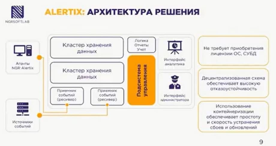ALERTIX does not require the purchase of DBMS and OS licenses. It is decentralized, therefore it provides high fault tolerance. The use of containerization ensures simplicity, speed of updating and troubleshooting.