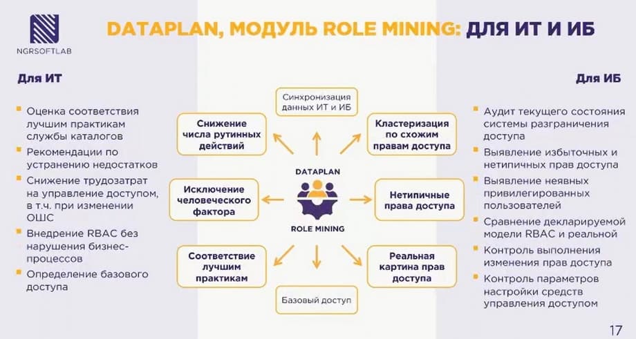 DATAPLAN, the ROLE MINING module connects AD as a data source, the directory service is divided into entities, roles are formed, it is tracked in which groups a person is, what rights are assigned to these groups, how the account data of this employee is filled in the directory, to which department he belongs, what is his position.