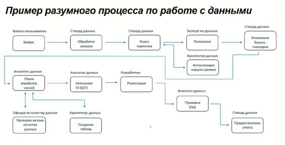 This slide shows an example of this process. A business user writes some request in the application management system that is familiar to him. This request goes to the data steward who already works with the data management tool, he processes the request, searches for the necessary terms. If he cannot find them, he turns to data experts to collect explanations. The data architect must update the model within the framework of this business user request. If necessary, business glossaries can be used if there is not enough information that was available. Or he goes directly to the data analyst, who, based on the connections between the business glossary and the data in the systems, will find the necessary attributes, check their quality. A data quality officer may be involved. But this is a conditional division. In principle, all this can be done by one person who is responsible for all these processes.