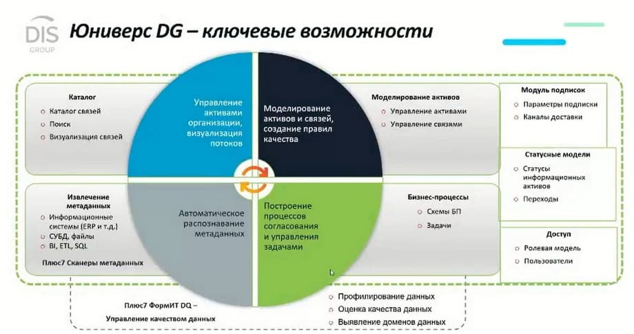 There is the possibility of visualizing data quality checks and their profiling. Above all this, there is a role model, a status model, there are opportunities to work with subscriptions. This is a full-fledged tool that closes all data management tasks from the point of view of platforms. Building a business glossary, building connections between different levels, checking the quality of maintaining registers - all this is closed by the tool in almost a single window.