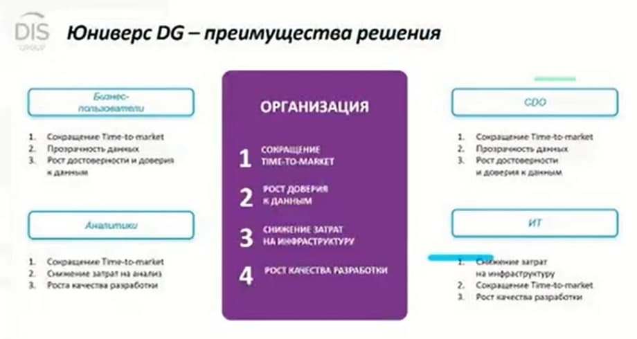 The main advantage is the reduction of time to market, that is, reducing the time to solve routine tasks of searching for where what data is located, what is their quality, how they are connected.