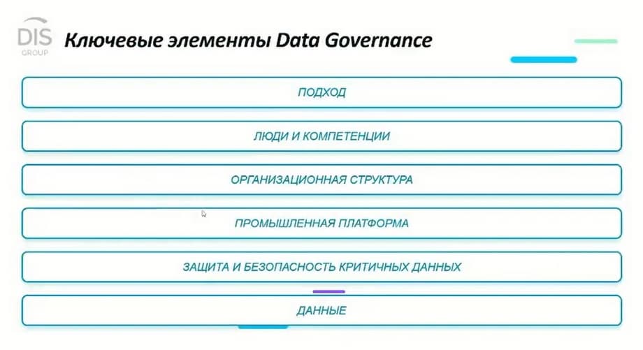 If we talk about the data management elements themselves, then here, if we talk about projects, about implementation at the customer's site, then, unfortunately, you can't just use the tool. Platforms that allow you to find the necessary data and somehow implement the management practice are not enough. A certain approach must be used, appropriate business processes must be implemented, and some changes in the organizational structure will most likely be required. All this is also an important element in data management.