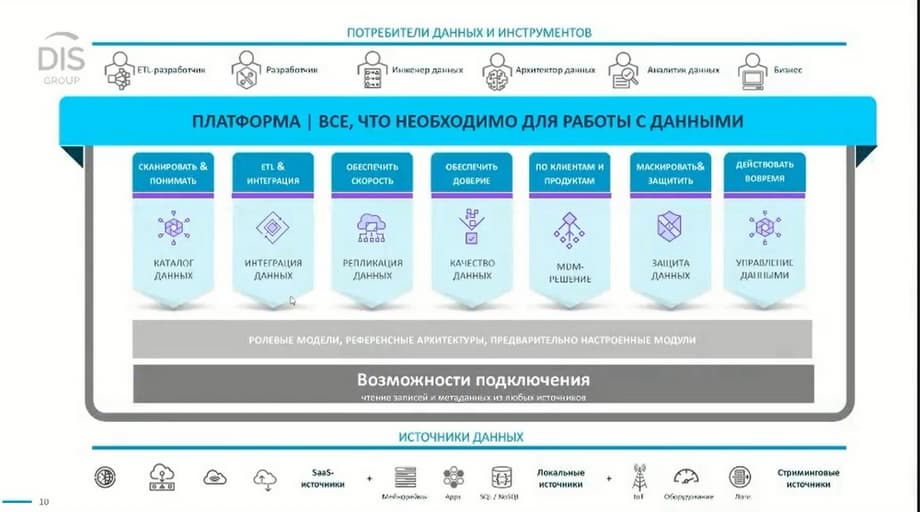 We have worked with Informatica software for a long time. And now we have switched to Russian solutions, we offer Data Innovation, Universe Data and DATAFLEET solutions. We have completed a large number of projects independently, a large number of projects - with partners. Our company is very diverse, from different market sectors. These include financial organizations, telecom, retail, and industrial companies, including oil and gas. We undertake any projects in the field of data management and data integration, master data management solutions. We implement these solutions on the platform that we offer, i.e. these are the main components that are responsible for data management. This is, I repeat, data integration, data quality solutions, master data solutions, and data management solutions, this is a business glossary and data catalog.
