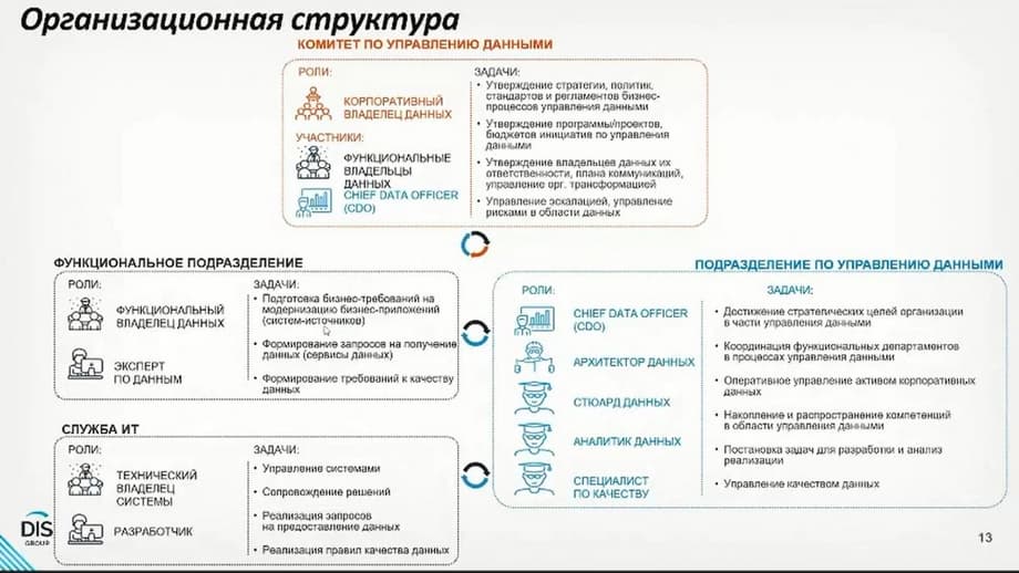 The data management committee has the role of Chief Data Officer, who usually has a data management department reporting to him. It may include data architects who are responsible for developing data layers, integration flows, data stewards who are responsible for describing business glossaries, analysts who may be located in functional departments or in the IT service, and a quality specialist. This does not have to be a separate department. And all these roles solve their specific tasks of describing data sets so that other users can quickly find the data they need, of maintaining a register of quality checks to show that the data is not just lying in this system, but they can be sure that it is up-to-date and reliable.