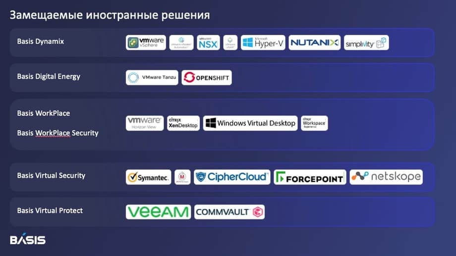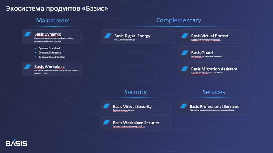Products of the new "Basis" ecosystem – from virtual infrastructure management tools and its protection to the conveyor for organizing a full development cycle – are the company's own proprietary developments. The flagship products are Basis Dynamix, a platform for managing virtual servers and containers, and Basis Workplace 2.0, a virtual workplace platform. Their functionality corresponds to foreign products, for example, from VMware and Microsoft (Azure/Hyper-V).