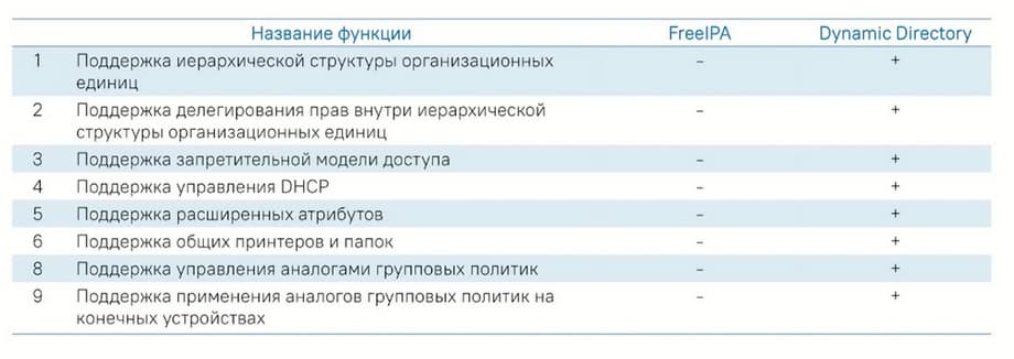 Next, we will compare the Open Source project with the Dynamic Directory system. If we take FreeIPA out of the box, it does not have support for a hierarchical structure of organizational units. That is, this is exactly the structure that we are all used to in Active Directory. Out of the box, FreeIPA does not have it. We have this function in Dynamic Directory. It is also important to support the delegation of rights within the hierarchical structure of organizational units. And this function provides more flexible functionality for transferring rights within the organizational structure of the company, which significantly reduces time. Also, support for the prohibitive access model, since there was no support for the hierarchy, then support for the prohibitive access model in FreeIPA is also not implementable. We have this functionality. Next, this is support for managing the DHCP server using the web interface, which accordingly increases ease of use. Support for extended attributes, as well as shared printers and folders. This functionality increases the percentage of security of interaction within the company, because it differentiates access. And support for managing analogs of group policies. And also an important functionality is support for applying analogs of group policies on the end device. That is, before applying the access policy, the administrator can check it without affecting the real infrastructure.