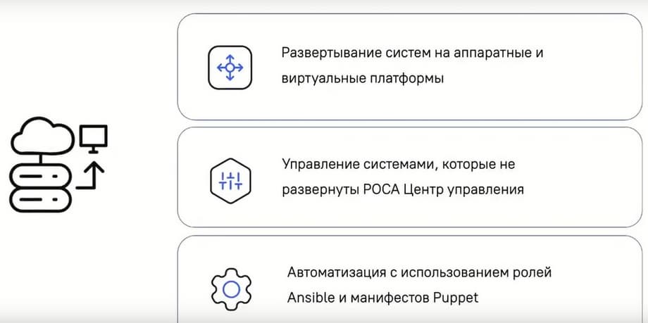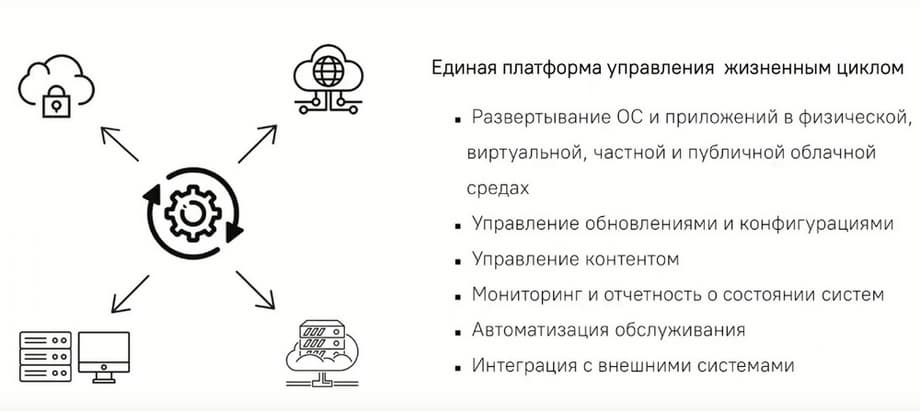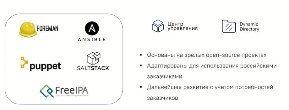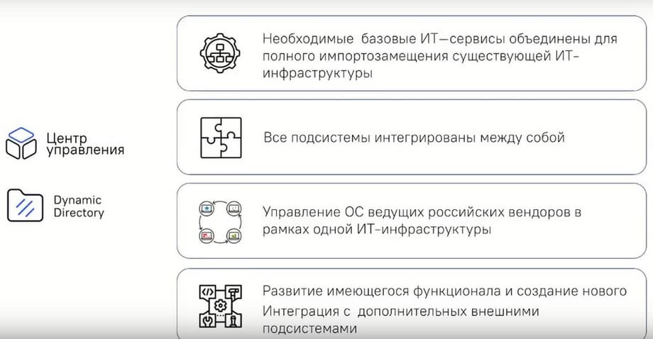 In the slide above, we can see which foreign products we are replacing. These include operating systems, virtualization systems, and centralized IT infrastructure management systems for companies. Since today we will be talking about centralized management, a few words about the goals and objectives that centralized management covers.