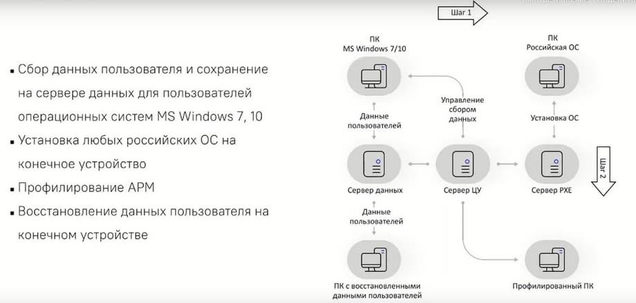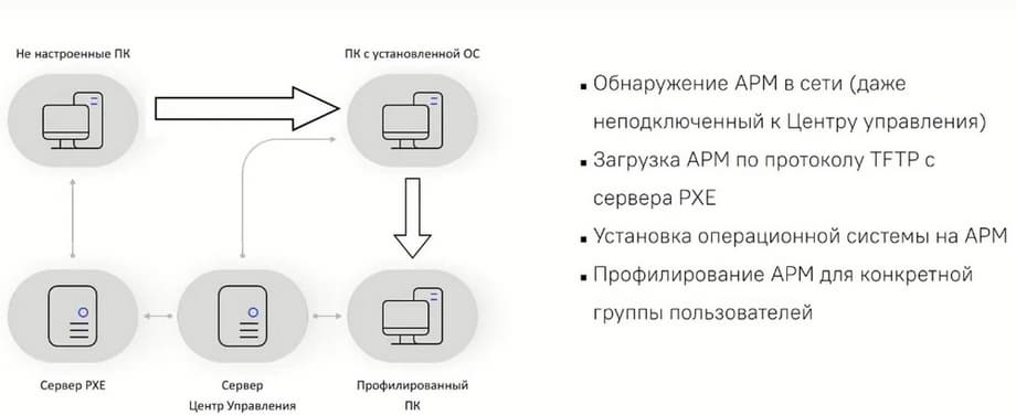 The Control Center collects data about users and saves it on the server. Next, the Russian operating system is also installed centrally, then the ARM is profiled, that is, all sorts of applications are added at the time of installation so that the administrator does not manually install all sorts of applications and services after installing the OS, which significantly reduces the administrator's working time and the time for deploying and configuring the operating system for specific tasks of the employee. And then there is also an automated restoration of user data on the end device.