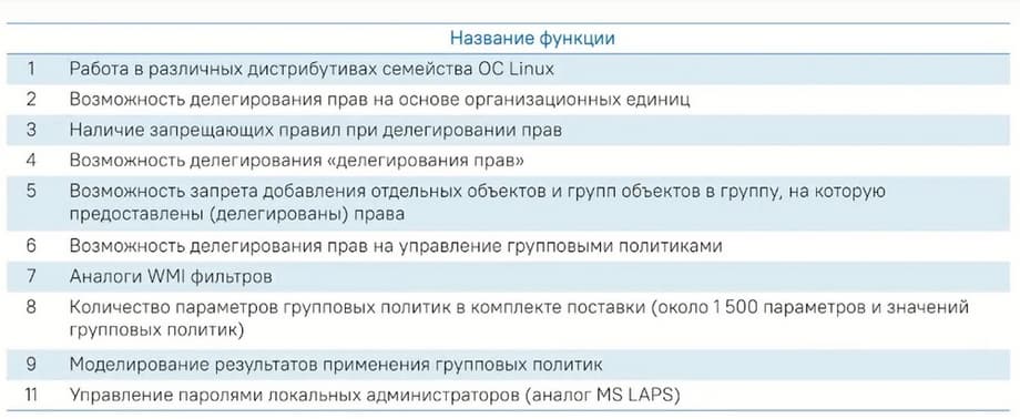 That is, ROSA, Astro Linux, RED OS, and Alt Linux. The ability to delegate rights based on organized units. Also, this is the ability to delegate rights. That is, in our directory service management system, there is the ability to delegate rights from one employee to another, and so on. The administrator can transfer rights to the next user, and the next users, within their powers, can transfer rights to the next user, and the administrator will not have to manually transfer rights to 10,000 users each time.
