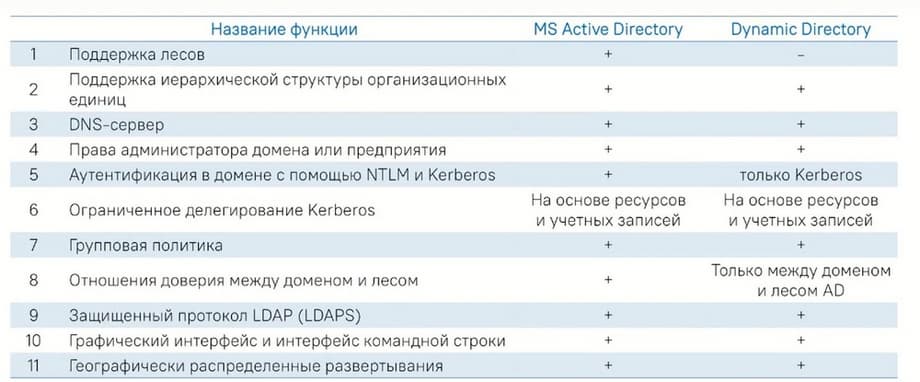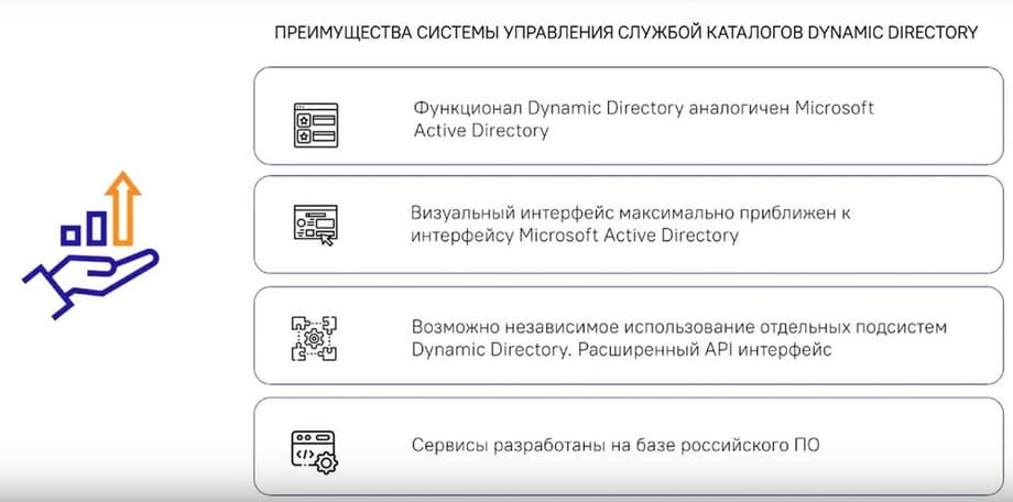 What advantages does the Dynamic Directory directory service management system give us? Firstly, the functionality of Dynamic Directory is as similar as possible to Microsoft Active Directory. The visual interface is also as close as possible to the Microsoft Active Directory interface. This is done so that administrators who have previously worked with Active Directory can quickly and with less cost switch to using Dynamic Directory. Also, our product has the ability to independently use individual subsystems of Dynamic Directory and an extended IP interface for adding all sorts of additional services, such as, for example, additional monitoring. And what is also important is that all services are developed on the basis of Russian software. Which will also be impossible when creating a similar product from some Open Source projects.