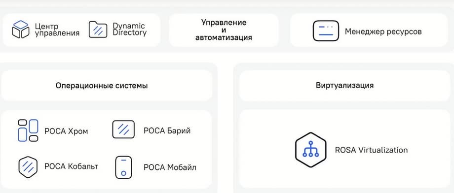 We have been on the market since 2010 and have sufficient expertise to meet the needs of IT products for companies. Let's start with our product portfolio. It consists of the following operating systems: ROSA Chrome, ROSA Barium, ROSA Cobalt, and ROSA Mobile. Also, a platform for centralized management of operating systems and access. This is "ROSA Control Center" and Dynamic Directory. The portfolio also includes the RОSA Virtualization virtualization environment and the hybrid and virtual environment management system, "Resource Manager."