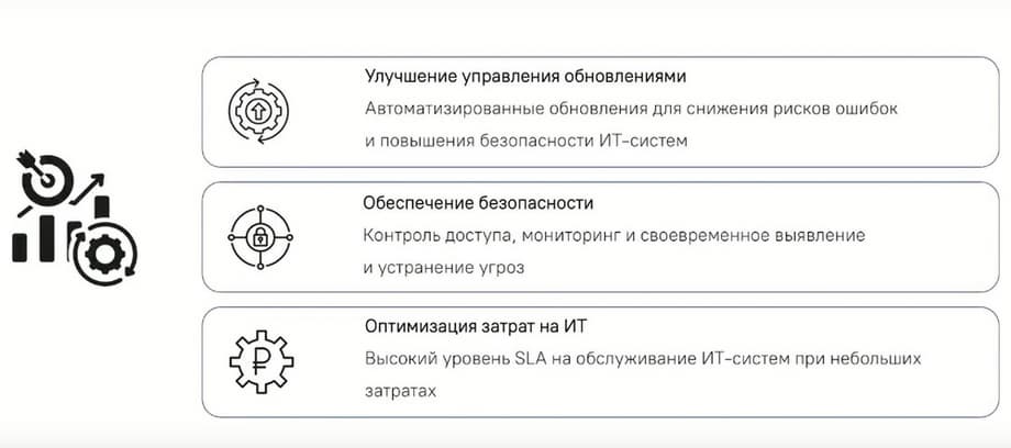 What other goals and objectives are there? It is improving update management. If we have intensive workstations in our company and they are not updated in time, then these are security breaches, this is the unavailability of all sorts of updated functions, and accordingly, this reduces the efficiency of employees working at the end devices. Also, optimizing costs for IT infrastructure, a high level of response to all sorts of incidents that have occurred and their prevention.