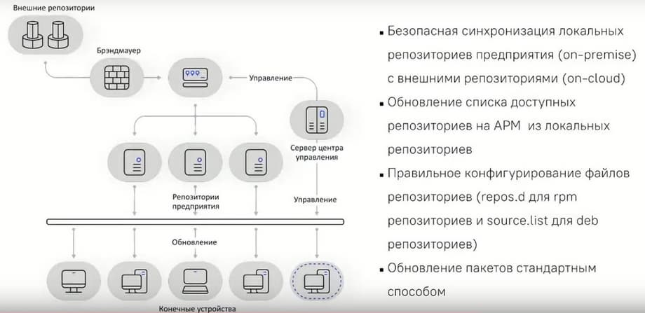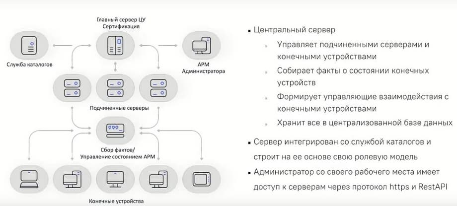 The architecture of the Control Center consists of the main control center and also subordinates. That is, the main control center is mainly engaged in certification, and accordingly, subordinate servers are engaged in managing end devices. There is also the possibility of managing local repositories to minimize all sorts of confusion with versioning for closed loops of companies.