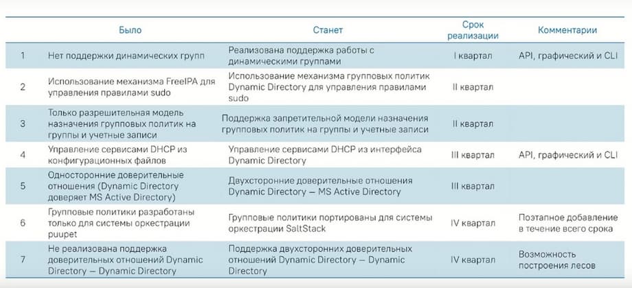 Here we can take a closer look at our roadmap in the development of Dynamic Directory. Let's take the third quarter. This is the management of DHCP services from the graphical interface and also from the console interface. Also, about two-way trust relationships, this is planned for the 3-4 quarter of 2024. And it is also planned to add support for the SoltStack orchestration system.