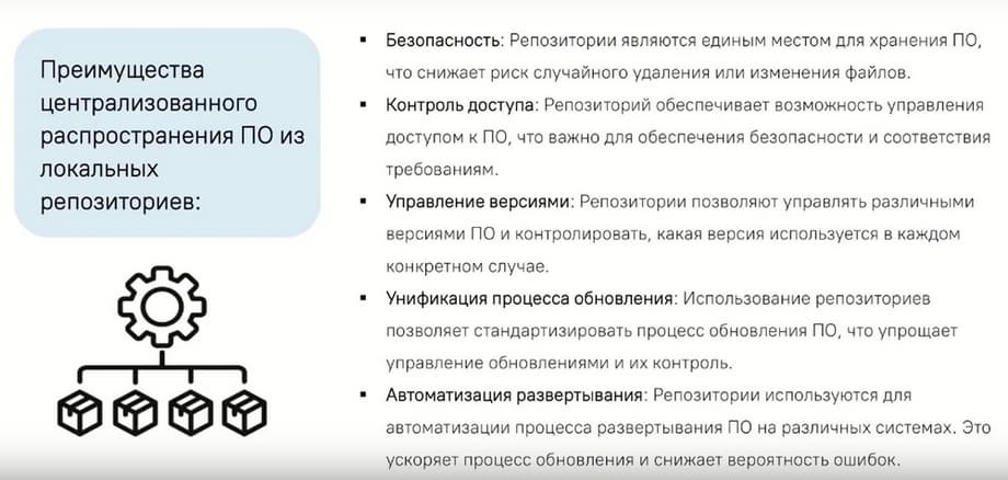 Reporting, in turn, allows you to respond in a timely manner to incidents within the infrastructure. ROSA Control Center also allows you to manage repositories. This is relevant for enterprises with a closed loop, where there is no Internet access. The repository is a single place to store software in a company with a closed loop. As a result, this greatly reduces the risk of accidental deletion or modification of files by the administrator or users. It also helps to manage versions within the local repository, because in the global repository, the software version may change, but for some reason it is not applicable in the current infrastructure. So, the administrator can manage this function and leave exactly the version that is necessary for use within the company on the local repository. Also, content management allows you to unify and standardize the update process, that is, all ARMs of the company will receive the same version of the software.