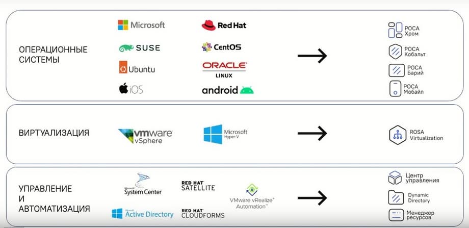 In this slide, we can assess which products of our company replace which foreign products. Dynamic Directory is a domestic directory service management system; it replaces Microsoft Active Directory, which many companies still use at the moment; they are used to the conveniences that this product has. Also, "ROSA Control Center," this platform is more suitable for managing end ARMs. It allows you to manage the configuration of both ARMs and operating systems on them. And it also helps to manage the distribution of software and its updates. Our system is based on free open source software. And our products are adapted for use by Russian customers in the Russian market.