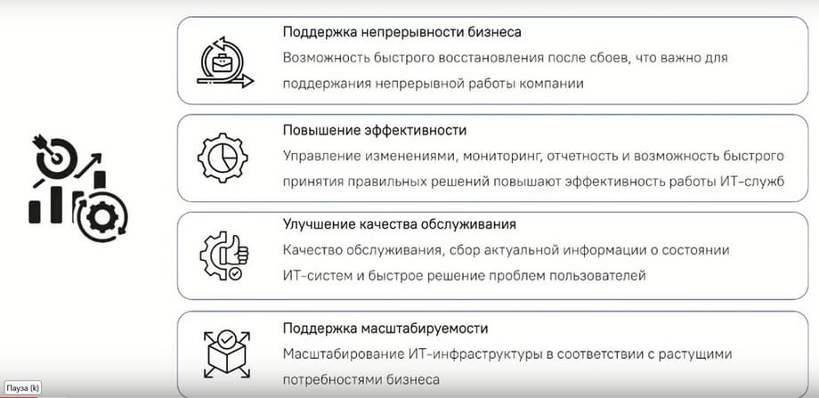 Achievability through centralized management is the support of business continuity. Why is this important? Because even the slightest downtime for a company means financial and reputational losses. Ideally, of course, these costs should be minimized. Next is increasing efficiency. Here, monitoring and reporting will help us to use resources more effectively. Then, of course, there is the improvement of service quality. That is, based on all sorts of metrics about the state of IT systems and the final ARMs within the company and their status. Next, there is scalability support. That is, any IT infrastructure, to be effective, must be able to quickly and efficiently scale to meet the needs of a growing business.