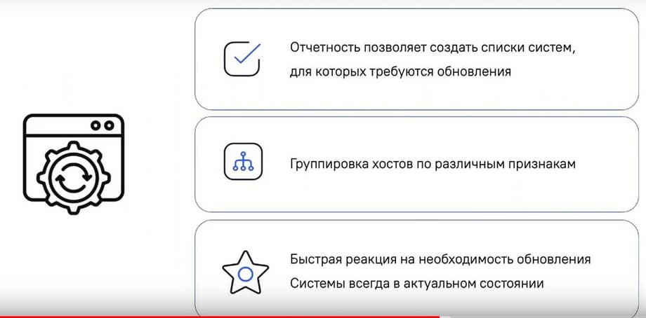 Update management allows you to create lists of systems that require updating. That is, in an automated mode, the administrator can track systems and receive notifications about those of them that should be updated in order to close vulnerability breaches and add updated functionality. It is possible to group hosts according to various criteria, that is, grouping hosts specifically of end ARMs, either by departments for ease of administration, or grouping by some memory criteria, by the state of processors, by the amount of RAM, and so on. That is, there are a lot of criteria and possibilities. Quick response to the need to update the system in order to keep it always up to date.