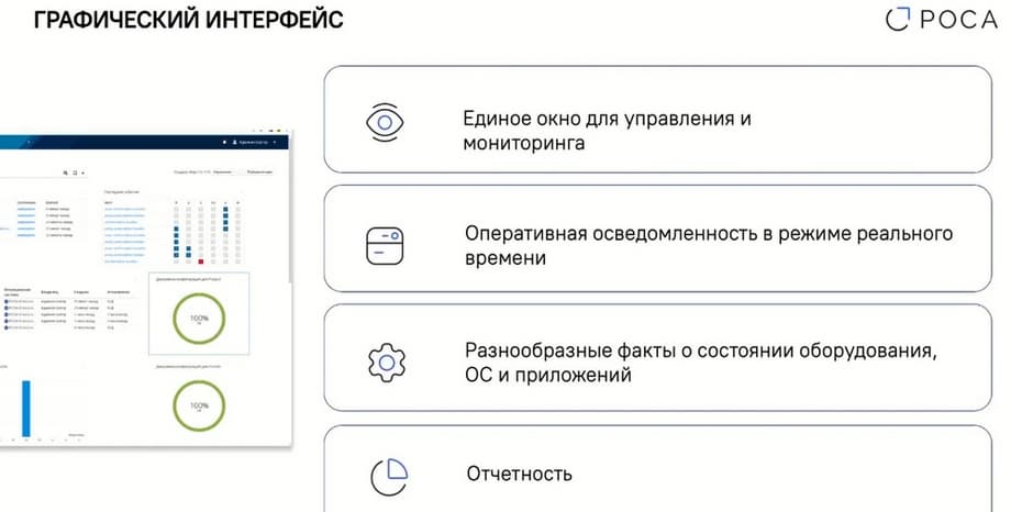 Just like in Dynamic Directory, in ROSA Control Center, we have an open API that you can add and integrate into your systems, for example, monitoring. The graphical interface of ROSA Control Center is a fairly simple and intuitive user interface, to which administrators of companies also quickly adapt based on feedback from our partners.