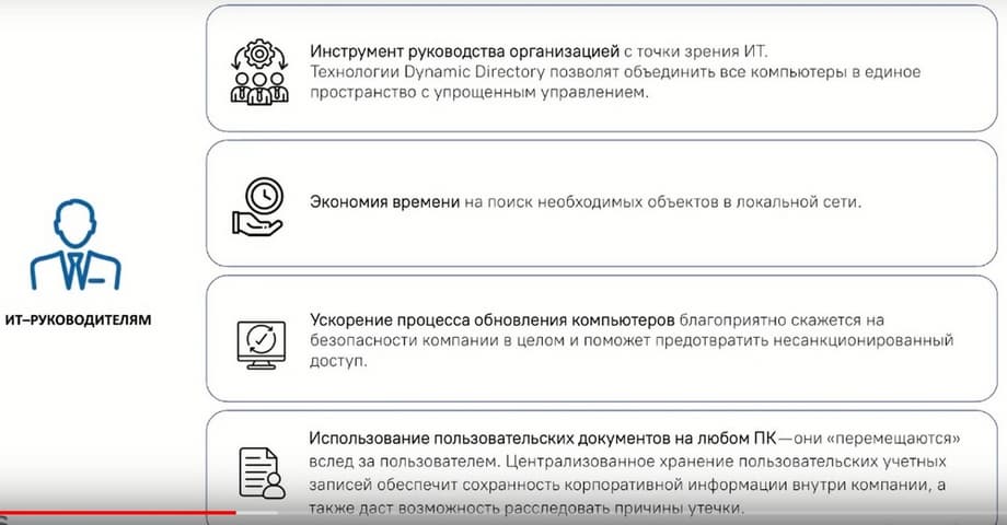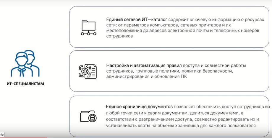 Also, the directory and access management system is necessary for IT managers. With the help of the directory service, managers will be able to track all ARMs, their status, and, accordingly, access to the company's resources in a single space. The second point is saving time searching for the necessary objects in the local network. That is, when everything is divided into folders, by departments, by access, it is much easier to search for all this and distribute access than if it were all in a common folder. Firstly, the search will take too much time. Secondly, each employee will be able to use each file and document, which is absolutely unsafe and ineffective.
