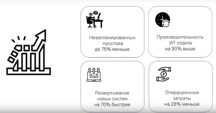 A few calculations based on feedback from our clients, that is, the effect of implementing centralized management: unplanned downtime is reduced by 75% due to the fact that there are fewer errors of the human factor, downtime due to the fact that the software was not updated in time or due to the fact that some software is specifically missing on the employee's PC and you have to manually install it. The productivity of the IT department increases by 30% due to the fact that IT specialists do not have to manually administer ARMs. All this is done centrally in a single window mode. The deployment of new operating systems also increases by 70% due to the fact that this also takes place centrally and all additional configurations, that is, all sorts of services, all sorts of applications, it is possible to install all these applications at the time of installation of the operating system. The company's operating costs are reduced by 28%. Unplanned downtime is 75% less compared to the absence of centralized management. That is, here we are talking more about managing end ARMs, and not about managing the directory service. Also, if we talk about the directory service section, then here we have 75% less downtime due to the fact that in the absence of a directory service system, we have a very large warehouse of company files, to which every employee has access. That is, here we do not have any structure and in order to use all sorts of documents and files, you need to spend quite a lot of time. When we have it structured, then accordingly it will take much less time and downtime in connection with the search for the necessary information, the necessary file is greatly reduced.