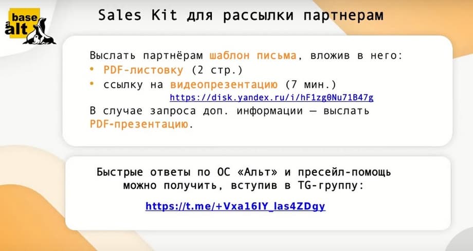 Какой у нас есть Sales Kit? У нас есть небольшой ролик на 7 минут, который можно рассылать вашим клиентам, если у вас есть какие-то партнеры, которые являются облачными провайдерами или которые просто с ними работают, то можно давать им ссылку на этот ролик. Есть некий шаблон письма, где очень кратко и емко написано, зачем нужны наши операционные системы в облаке, какие задачи они решают. Ну, также есть уже более углубленная pdf-презентация, но она нужна только если уже заказчик проявил интерес и хочет ознакомиться поподробнее, то есть уже презентация ссылками с более подробным объяснением.