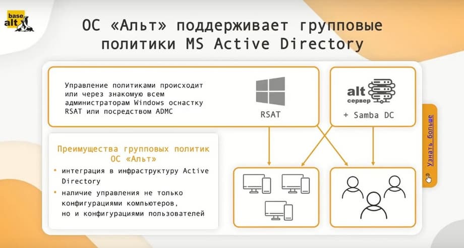 Все наши конкуренты, такие как американский ubuntu, fedora, у них такой поддержки нет. Там миграция возможна только в жестком формате. А это очень большой риск. Сам инструмент, который позволяет вводить в домен новых пользователей, давать им права доступа, давать им какие-то пароли, у Windows это называется RSAT. Этот инструмент очень хорошо знаком всем Windows администраторам. Наш инструмент называется ADMC. Функционально он делает то же самое. Администраторы говорят, что он даже интеллектуально немного проще. То есть содержит более понятный интерфейс. Но в общем оба этих инструмента, они могут работать одновременно в одной сети и не иметь никаких проблем. Кроме того, у нас можно водить не только машины, но и пользователей.