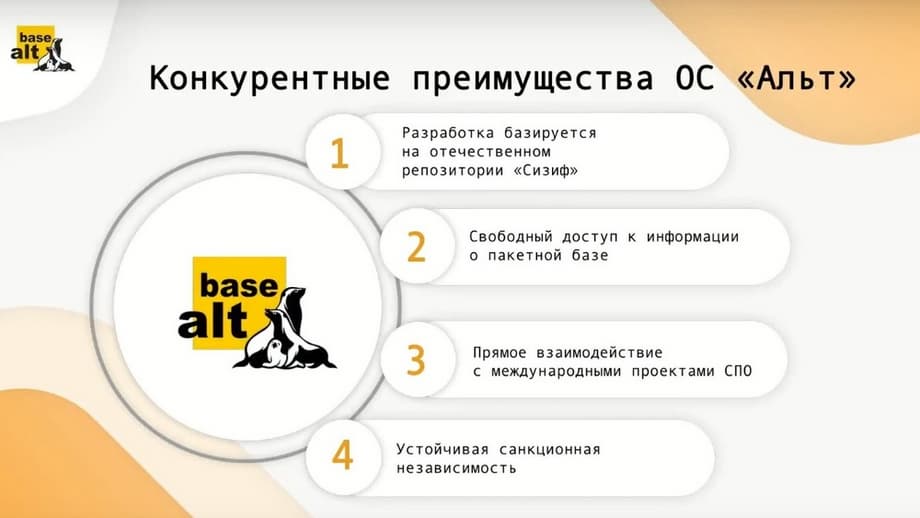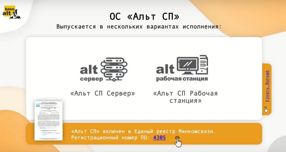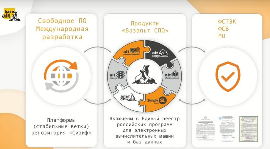 У нас свой международный независимый проект «Сизиф», который мы и используем в качестве базы для построения всех операционных систем семейства Альт. Все наши продукты, кроме Simply Linux, включены в единый реестр, что подтверждает сертификаты в ФСТЭК, ФСБ и Минобороны. Здесь представлены наши продукты.