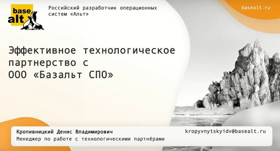 Передаю слово Денису Кропивницкому, менеджеру по работе с технологическими партнёрами, «Базальт СПО». Он расскажет про технологическую партнёрство.