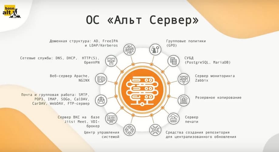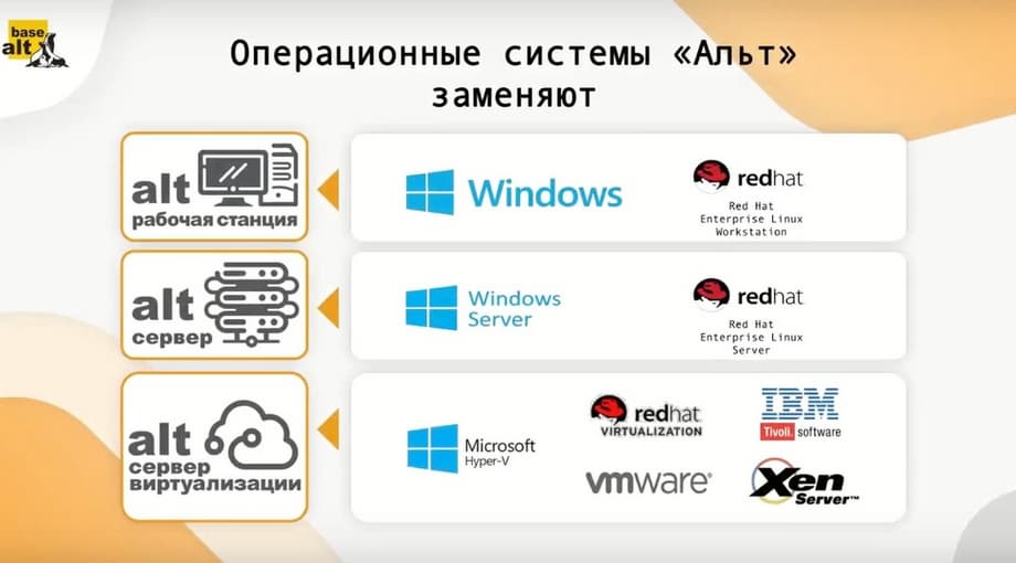 Это две серверные ОС: Альт Сервер - обычная и Альт СП Сервер, которые имеют сертификат ФСТЭК и встроенные средства защиты. Какое главное преимущество Альт Сервера? Это поддержка именно Windows контроллера домена, который называется Microsoft Active Directory. Альт Сервер – это серверная операционная система, которая обладает всем необходимым набором функционалов, который необходим. То есть, это почтовый сервер, это сервер мониторинга, резервное копирование, сервер ВКС, сервер печати, различные внешние службы, таких как DNS, ну и поддержка контроллера домена. То есть это всё входит в функционал этой операционной системы. То есть она обладает всем необходимым набором функций, которые нужны, в принципе, любому заказчику. И полностью заменяет аналоги зарубежных производителей, такие как Windows, в частности.