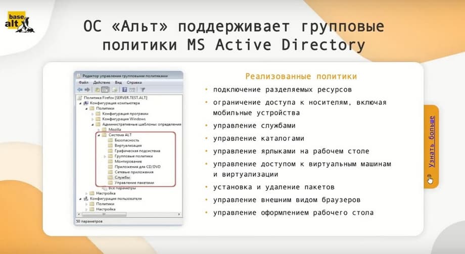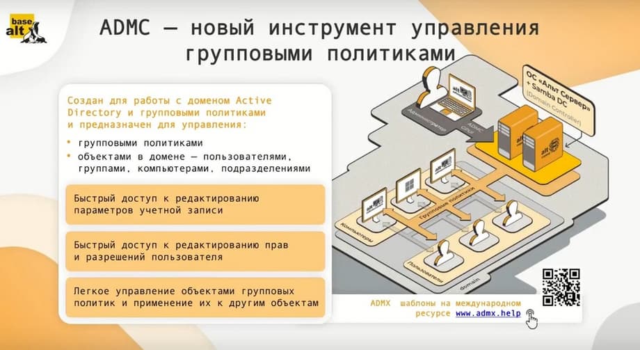 - ОС «Альт Сервер». Альт Домен / поддержка MS AD, Samba, ADMC;